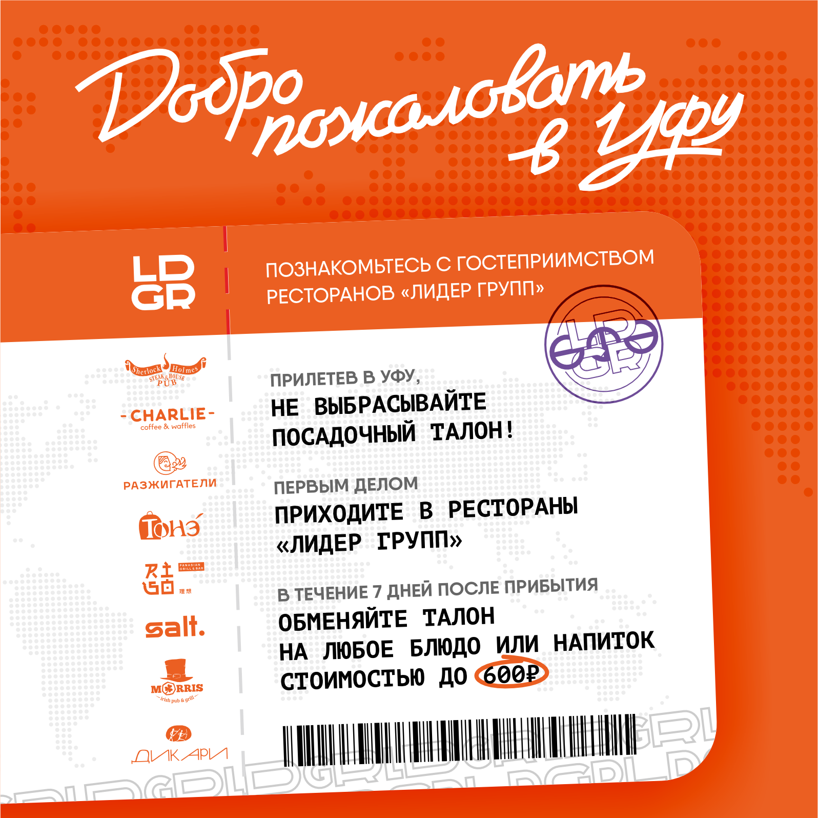 Приятнее отпуска может быть только одно – возвращение домой. Приезжая с отдыха или рабочей командировки, не забывайте о главном: в ресторанах LDGR вы можете обменять посадочный талон на любое блюдо стоимостью до 600 рублей.