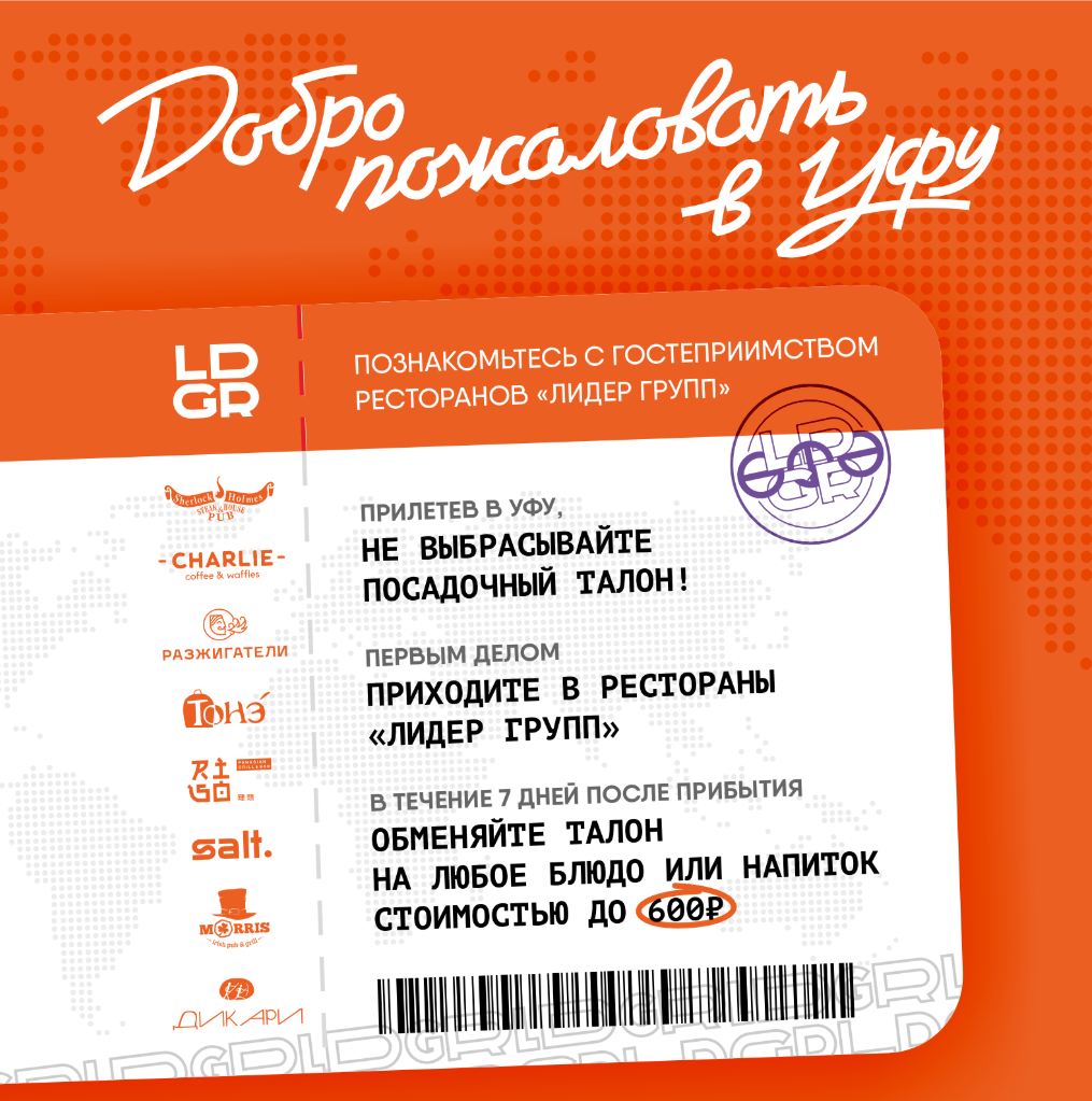 Приятнее отпуска может быть только одно - возвращение домой. Приезжая с отдыха или рабочей командировки, не забывайте о главном: в ресторанах Leader Group вы можете обменять посадочный талон на любое блюдо стоимостью до 600 рублей.