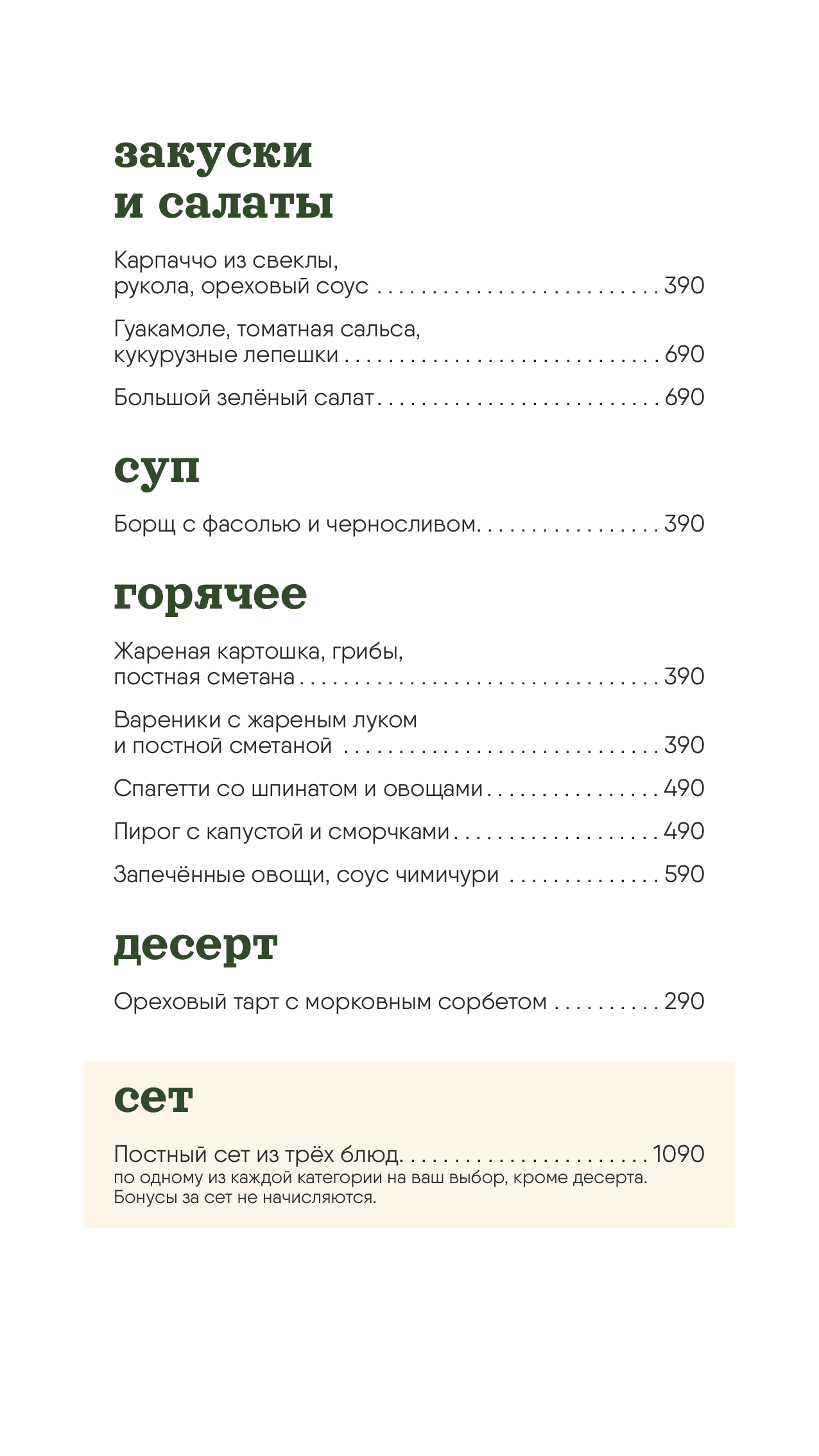 - Постный сет из 3-х блюд, по одному из каждой категории на ваш выбор кроме десерта